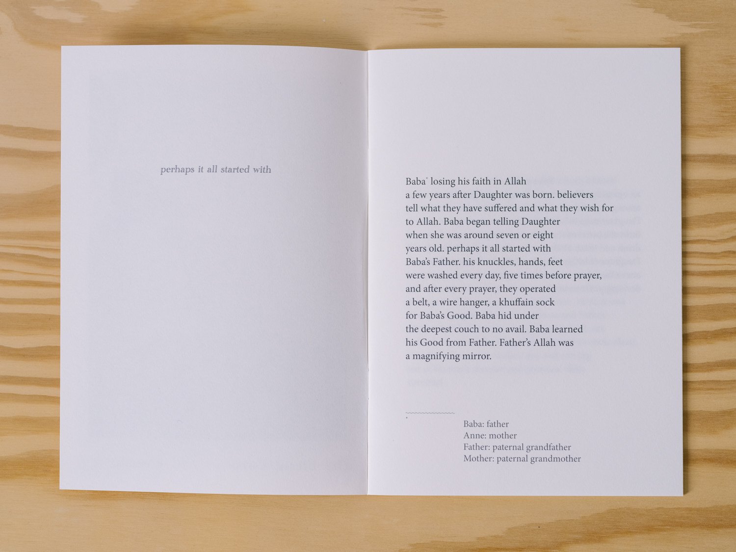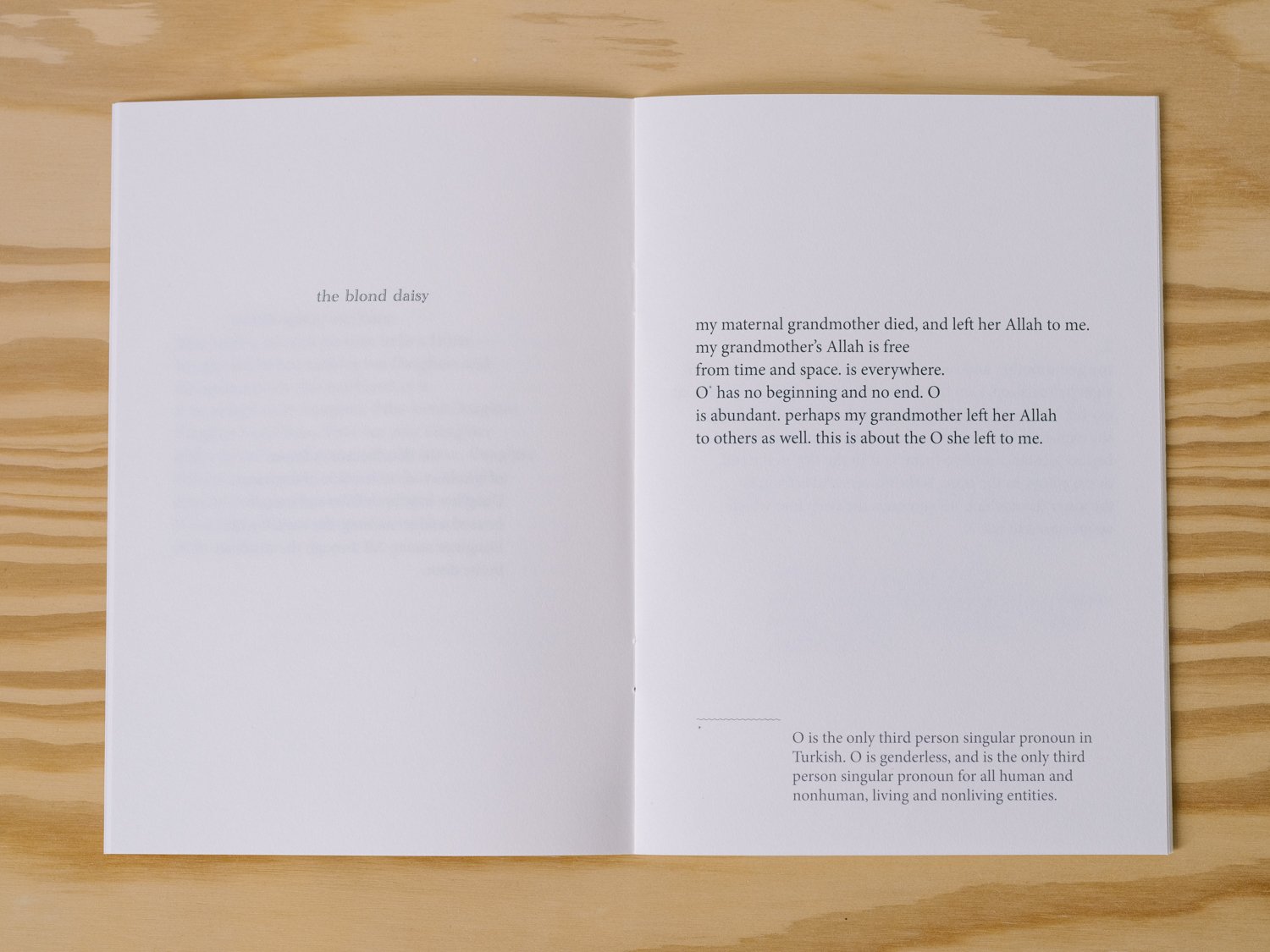 e. irem az’ The Blond Daisy is a booklet composed of two multi-section poems, including the eponymous poem, about irem’s late grandmother, Zinet Tosun, and her Allah, at once universally boundless and simultaneously present in diurnal labor; and “perhaps it all started with,” which resurfaces smothering intergenerational trauma, zeroing in on domestic thresholds as simultaneously a seal but also potential escape route.
